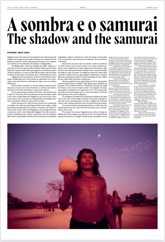 ※ブラジルで12月から開催されるベレンでの写真展『ナガクラヒロミ展、アユトン・クレナックとアマゾンをいく』の開催に合わせて、主催者であるトミエ・オータケ美術館とアマゾン銀行が作成したもので、展示の内容とその意義が書かれています。記事中で、アユトンの「長倉洋海はサムライだ。彼の剣はカメラである」という書き出しから始まる記事は、長倉洋海について、また一緒に訪れた五つの地域の先住民たちについて語っています。